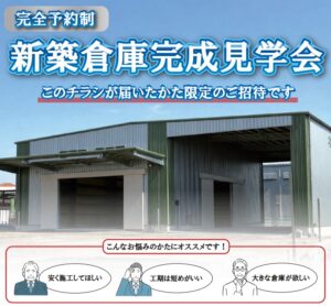 「コストを抑えたい」「短工期で建てたい」「大規模な倉庫を検討している」といったご相談にも個別に対応いたします。豪華なお土産付きの完全予約制となっておりますので、ご興味のある方はお気軽にお問い合わせください。